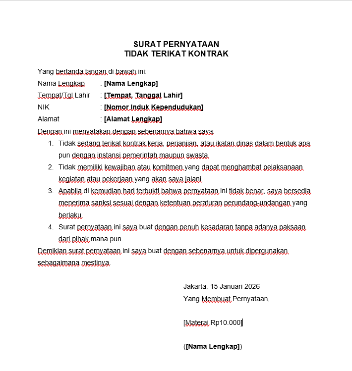 Selanjutnya, kamu dapat menggunakan contoh surat pernyataan tidak terikat kontrak yang telah kami siapkan dan sesuaikan dengan kebutuhanmu.